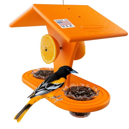 Dutchcrafters offers several plastic “poly” oriole feeders made from recycled plastic lumber. These feeders often include jelly cups, fruit slice holders, and sometimes nectar cups, all arranged on bright orange platforms that orioles can’t resist.
